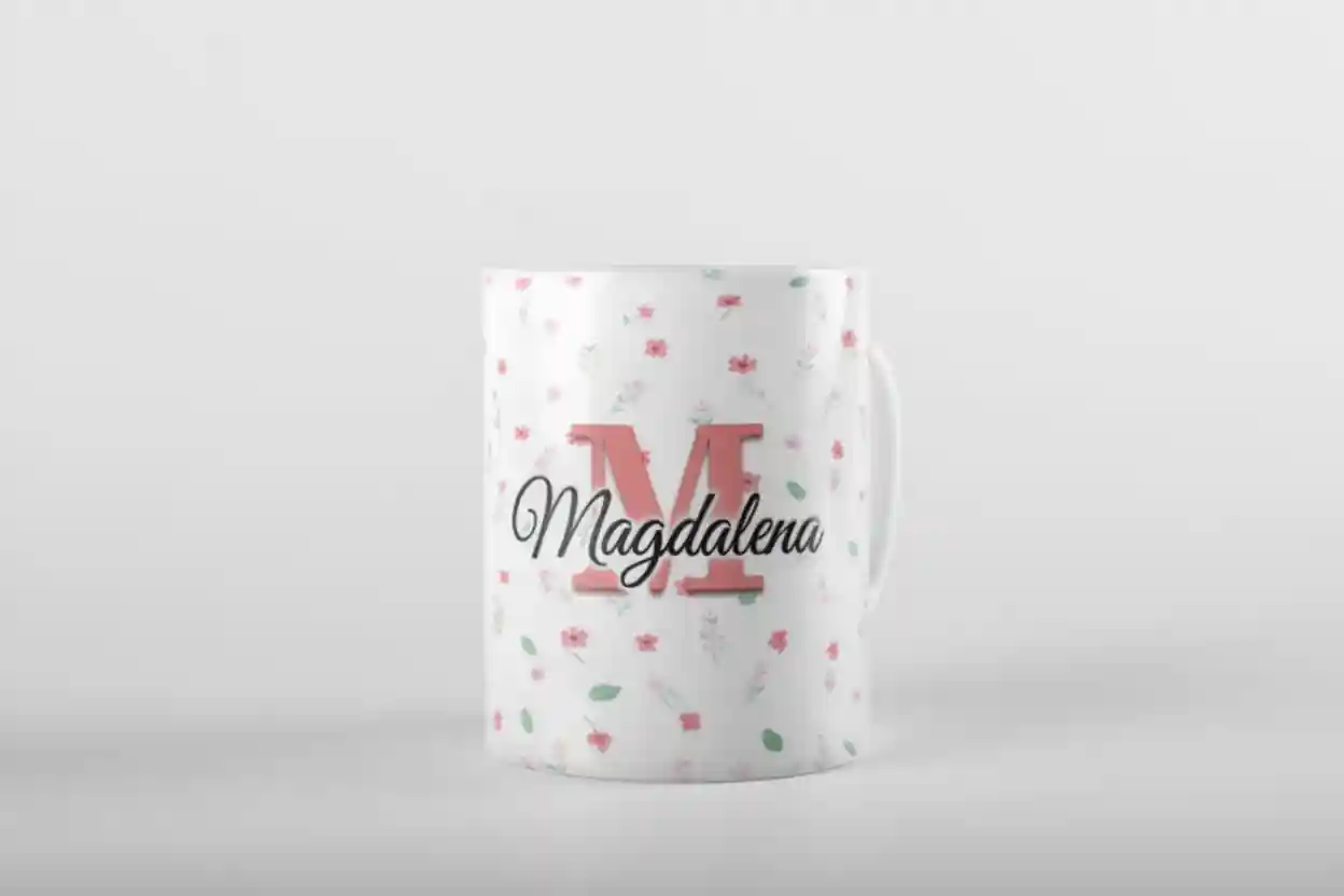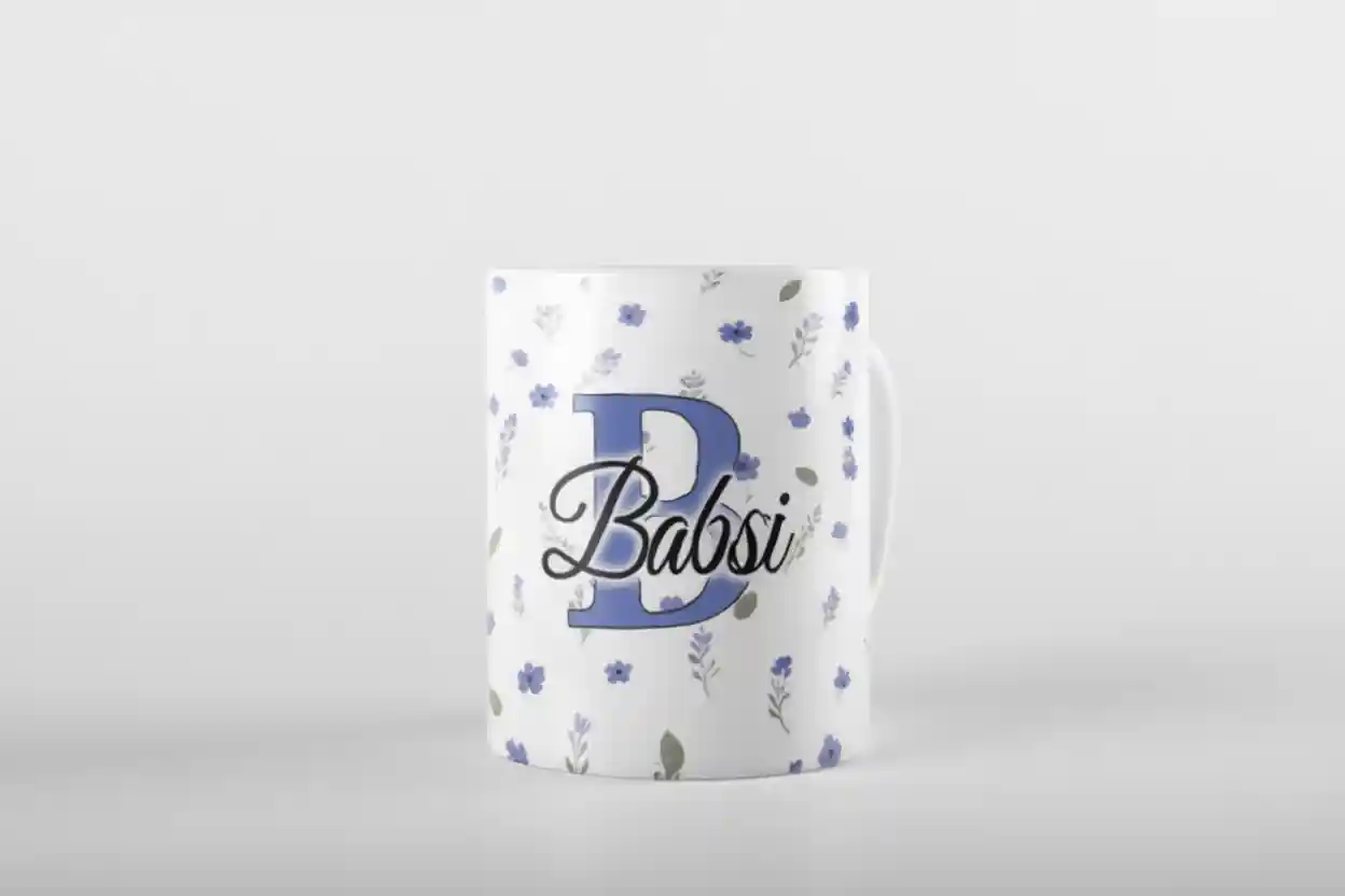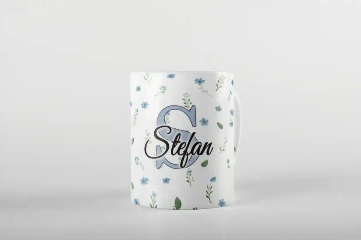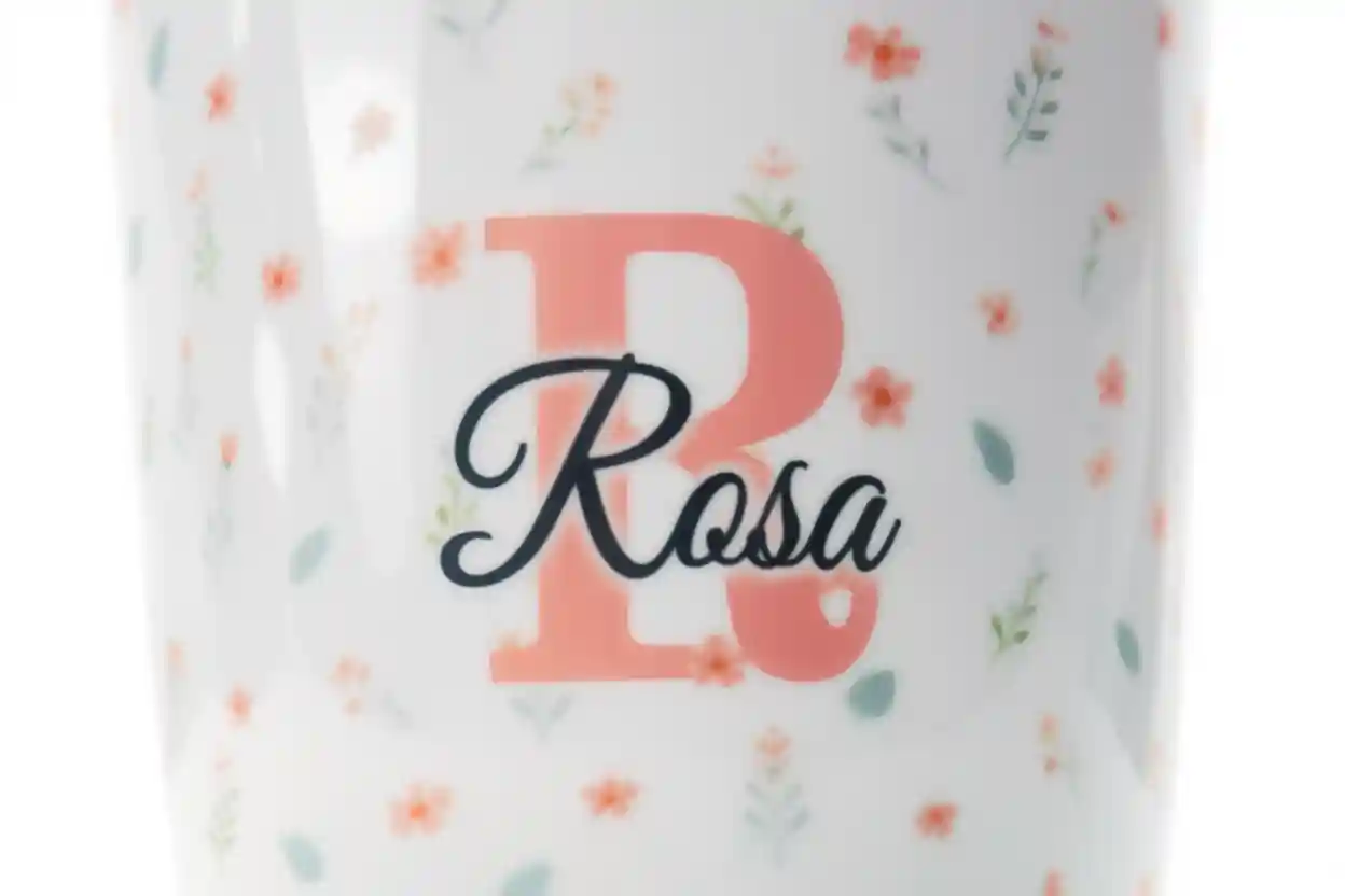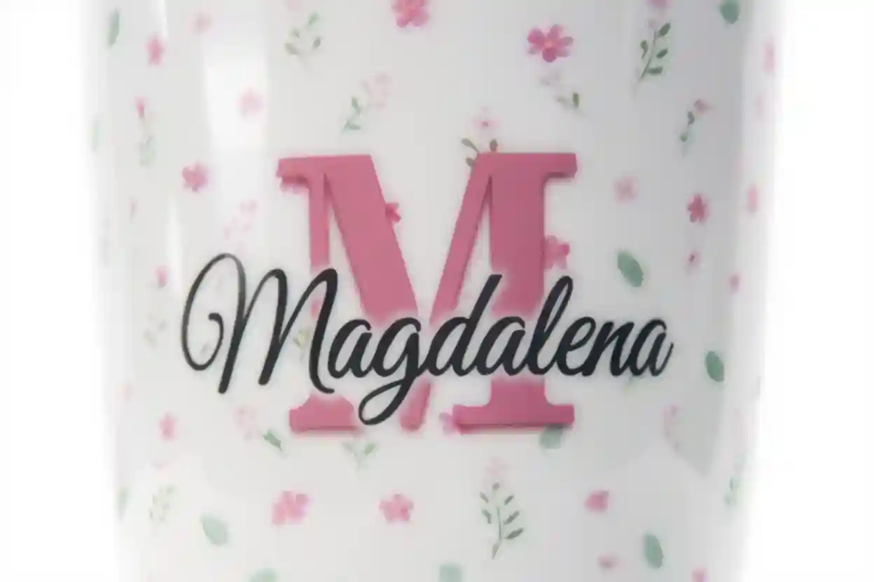 Personalisierte Keramiktasse mit deinem Namen und Blümchenhintegrund.