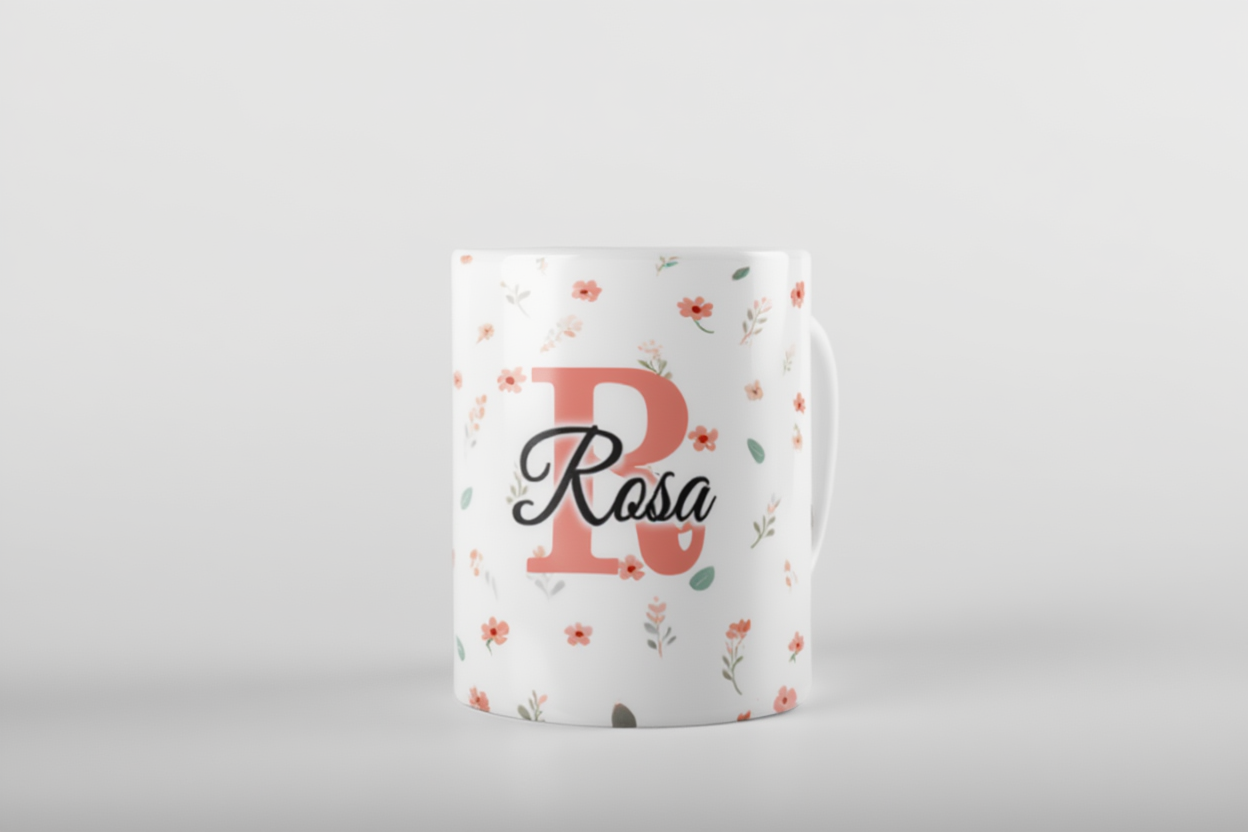 Personalisierbare Keramik-Tasse mit Blümchenhintergrund und Initial – dein stilvolles Geschenk für jeden Anlass